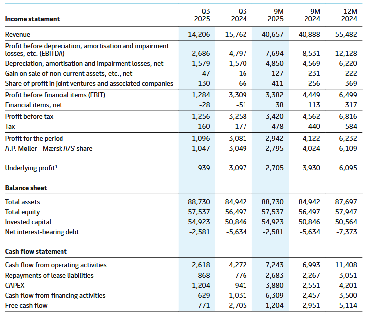 全球集装箱航运巨头马士基(AMKBY.US)2025年第三季度盈利表现好于预期泸深在线,同时上调了全年盈利预期及全球集装箱市场增长预测。数据显示,马士基第三季度营收为142.06亿美元,较上年同期的157.62亿美元下降9.9%;剔除一次性项目的基本利润(Underlying profit)为9.39亿美元,较上年同期的30.97亿美元下降69.7%;每股收益为69美元,远低于上年同期的193美元,但好于分析师普遍预期的62美元。